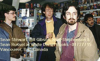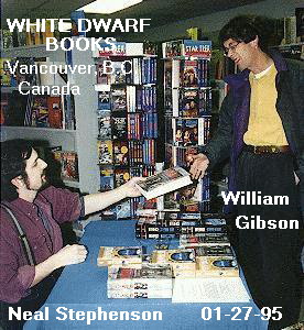 The pictures below are of "Bill" Gibson receiving an autographed copy of fellow sf author Neal Stephenson's, Diamond Age (Bantam 1995) at a signing hosted by White Dwarf Books, in Vancouver. While Stephenson lives in Puget Sound area, part of the Diamond Age story takes place in Vancouver, B.C.