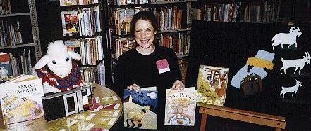 Jane Cobb, demonstrates setting up a Children's story time, with felt board, stuffed animal toys, books, and name tags, and tape-player. This picture is done on-location at the Fraserview Branch of the Vancouver Public Library.